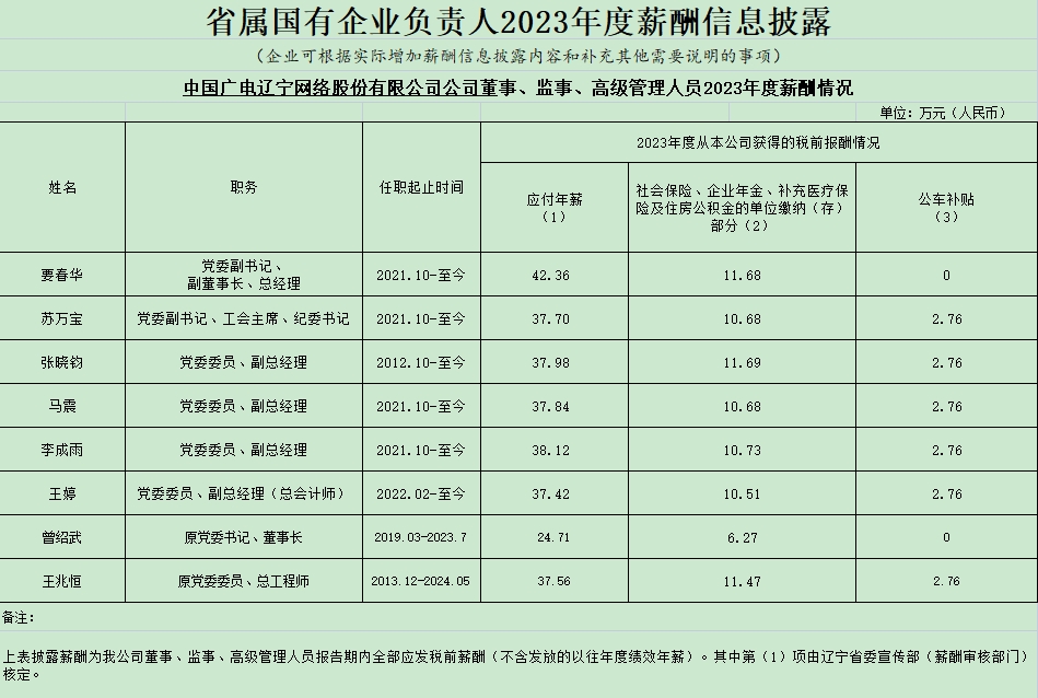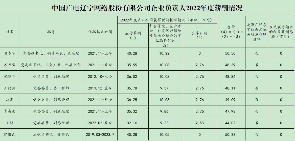 中國廣電遼寧網(wǎng)絡(luò)股份有限公司公司董事、監(jiān)事、高級管理人員2023年度薪酬情況